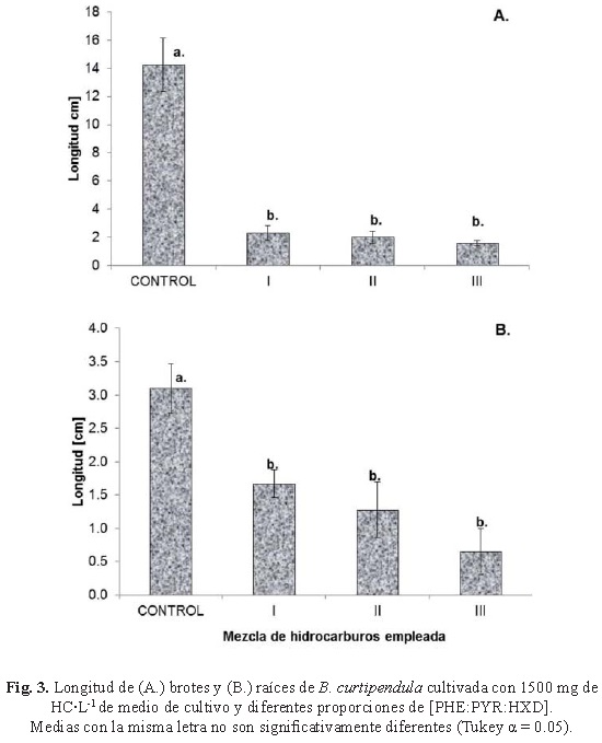 Con respecto a la producción de biomasa de brotes (fig. 2A) y de raíces (fig. 2B) en los cultivos de B. curtipendula se observó una disminución de más del 80% en el peso seco con respecto al control. La elevada concentración de HC empleada en este trabajo también propició una disminución de hasta un 80% en la longitud de brotes y raíces de las plantas (fig. 3A y B respectivamente).