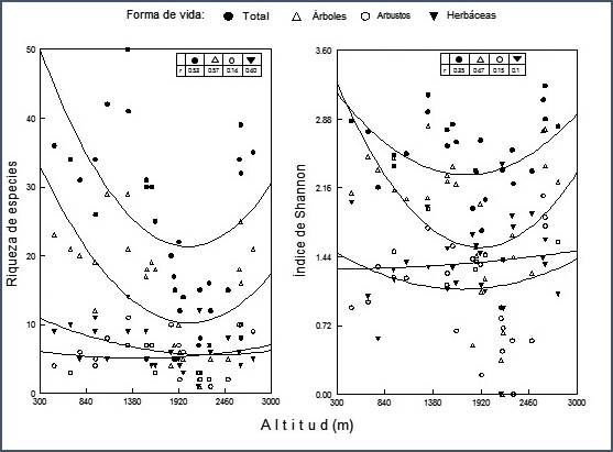 Los valores de riqueza encontrados son similares a los reportados por Ávila Sánchez et al., (2010). Se observó un patrón de U, donde la riqueza total de especies fue mayor en los extremos del gradiente altitudinal y menor en la parte intermedia (1 350-2 400 m). En la parte baja (450 a 1 400 m), la riqueza florística mostró una tendencia de disminución con el incremento de la altitud. Macía & Fuertes (2008) , encontraron una disminución lineal de la riqueza con el incremento de altura y un cambio en la composición florística en un bosque tropical montano donde predominan las familias Lauraceae, Melastomataceae, Rubiaceae y Asteraceae. Sugieren que la diversidad florística en los bosques montanos disminuye linealmente a altitudes mayores a 1 500 m. Otros estudios realizados a lo largo de gradientes ambientales (Rahbek, 1995, 2005; Sánchez-González & López-Mata, 2005; Sang, 2009; Zhu, 2007) en distintos ecosistemas han encontrado un patrón unimodal, donde la mayor riqueza de especies vegetales se presenta en altitudes intermedias. De manera particular en los ecosistemas montañosos de México, este patrón obedece en gran medida a la distribución de los bosques mesófilos de montaña, los cuales se encuentran principalmente en intervalos de entre los 900 hasta los 1 800 m de altitud (Challenger, 1998; Vazquez & Givnish, 1998; Villaseñor, 2010).