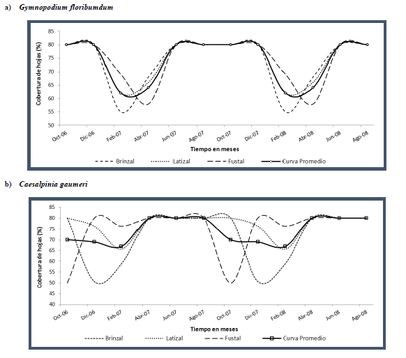 Pennington y Sarukhán (2005) indican que la mayoría de las especies arbóreas de las selvas bajas caducifolias, pierden sus hojas totalmente por periodos de cinco a siete meses; caso contrario con lo registrado para G. floribundum y C. gaumeri para la zona de estudio, puesto que la mayor parte del tiempo (10 meses, de mayo a febrero) la cobertura foliar fue de 55% a 80%, y sólo para el caso de C. gaumeri alcanzó valores de 0% en el mes de enero. Estas diferencias se deben, principalmente, a las condiciones edáficas y climáticas tal y como fue demostrado por Simei et al. (2016) en plantaciones de Cordia dodecandra en el estado de Yucatán, puesto que, siendo una especie netamente caducifolia, los individuos que recibieron riego durante todo el año no defoliaron completamente, atribuyéndolo a las condiciones de humedad presentes en el suelo y el ambiente debido al riego.