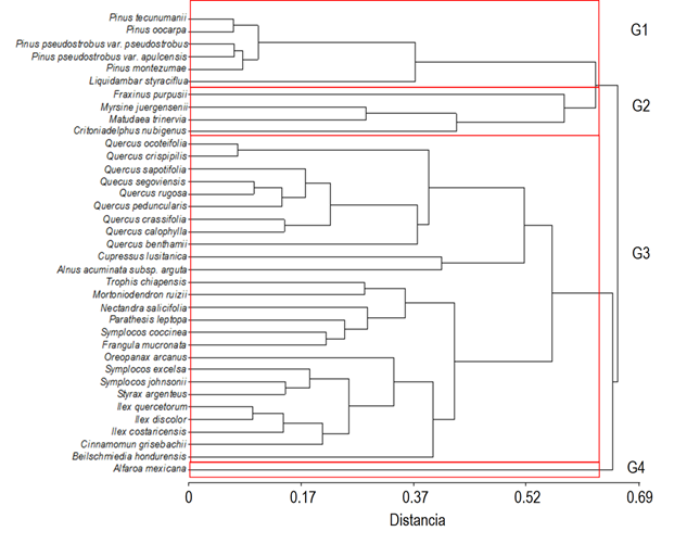 El análisis de agrupamiento permitió observar la formación de cuatro grupos de especies con base en sus similitudes de los rasgos funcionales (Fig. 2). La correlación cofenética para las variables estandarizadas fue de 0.908. Un primer grupo (G1) diferenciable del resto lo constituyen todas las especies de Pinus, además de Liquidambar styraciflua todos característicos de especies tempranas y frutos secos con semillas dispersadas por viento. El Grupo 2 (G2) incluyó a cuatro especies latifoliadas (Matudaea trinervia, Myrsine juergensenii, Fraxinus purpusii y Critoniadelphus nubigenus).
