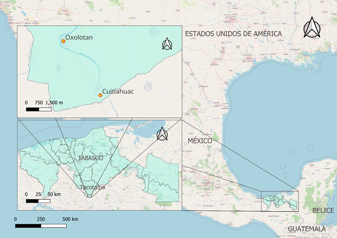 El estudio se llevó a cabo en las comunidades de Cuitláhuac y Oxolotán, Tacotalpa, Tabasco, este municipio encuentra entre las coordenadas 17° 35' 5" latitud norte y 92° 49' 6" longitud oeste. Colinda al norte con los municipios de Jalpa y Macuspana, Tabasco, al sur y al este con el estado de Chiapas y al oeste con el municipio de Teapa, Tabasco ( 1). De acuerdo con Morales-Valenzuela & Carrillo-Contreras (2020), estas localidades forman parte de la Región Biocultural Ch’ol de Tacotalpa.