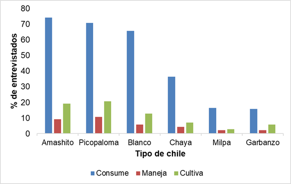 En lo que respecta al manejo y cultivo, se observó que los chiles amashito, picopaloma y blanco son los que más se manejan o cultivan (Figura 2). Es importante señalar que las prácticas de manejo se refieren a las técnicas que contribuyen a la conservación de las poblaciones silvestres de chiles, mientras que las prácticas de cultivo se centran en la producción intencionada de variedades seleccionadas. En las entrevistas a profundidad se mencionó que la práctica de manejo más importante es la recolección, así lo señala un entrevistado: