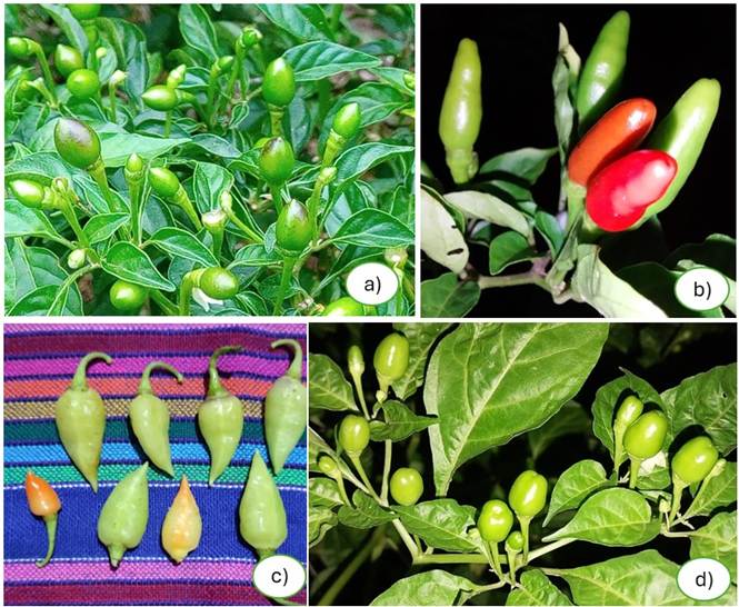 Figure 3 Wild chili peppers most used in the Tabasco mountains. a) Amashito, b) Picopaloma, c) Blanco y d) Garbanzo.