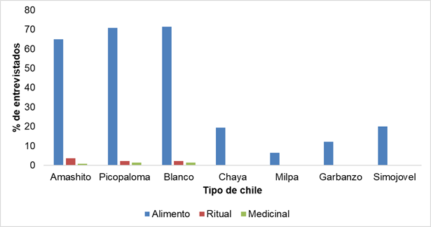 Basado en el uso medicinal, los chiles picopaloma, amashito y blanco tienen este uso, ya que los entrevistados lo usan para prevenir problemas respiratorios, particularmente el Covid19. Similar a lo encontrado por Martínez Torres et al. (2021) quienes señalan que, en comunidades de Querétaro, el chile piquín (C. annumm var. glabriusculum) se utiliza para las infecciones pulmonares y las fiebres. Al respecto, Bernstein et al. (2011) demostraron que la capsaicina intranasal mejora de forma rápida y segura los síntomas en sujetos con rinitis, es decir, el consumo de chile puede mejorar la secreción nasal y aliviar la congestión nasal. Asimismo, López Ordaz & Yáñez Fernández (2023) mencionan que los chiles proporcionan efectos farmacológicos benéficos en tratamientos contra artritis, rinitis, sinusitis, migraña y enfermedades cardiovasculares, anticancerígenas, obesidad, y diabetes tipo II.