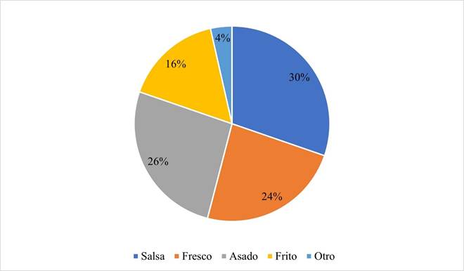 En este estudio, los entrevistados identificaron cuatro formas principales de consumo: en salsa, fresco, asado y frito (Figura 5). Sin embargo, la preferencia depende del tipo de chile. Por ejemplo, los chiles picopaloma y amashito suelen consumirse en salsa, pero previamente asados al comal, mientras que los chiles blanco y garbanzo se utilizan en salsas en su forma fresca. Estos resultados coinciden con los hallazgos de Castellón-Martínez et al. (2012), quienes indican que los chiles regionales de Oaxaca se consumen principalmente en salsas.