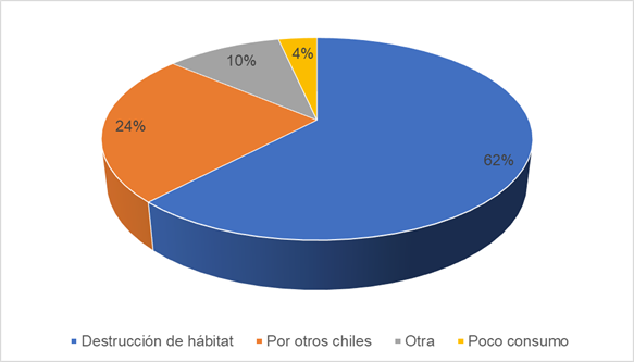 Por otra parte, aunque solo el 21% de los entrevistados considera que los chiles silvestres están en riesgo de desaparecer, la mayoría señala que la principal causa es la destrucción de su hábitat (Figura 8). Como se mencionó anteriormente, la eliminación de las áreas donde crecen estos chiles y el deterioro del ecosistema han puesto en peligro de extinción a estas especies, una preocupación enfatizada por Montes-Hernández et al. (2006) en el caso del chile piquín (C. annumm var. glabriusculum).