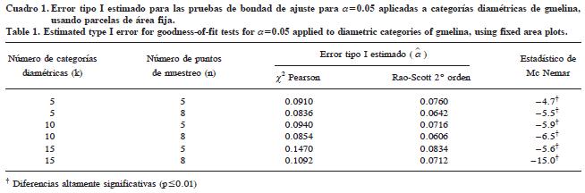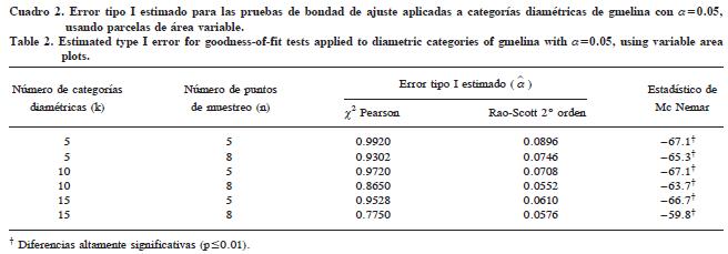 crece cuando aumenta el número de categorías diamétricas. En el muestreo con parcelas de tamaño variable (Cuadro 2), el error tipo I estimado es menor para un número mayor de categorías.