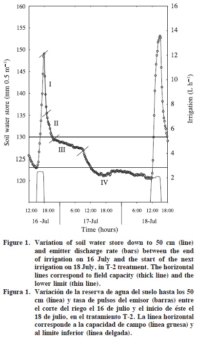 Figure 2 shows the volumetric soil water content at different depths (10, 20, 30, 40 and 50 cm), together with the soil water store down to 50 cm, and the irrigations applied during one week in July, in the T-2 treatment. The figure depicts the typical soil water content dynamic. The irrigation events caused a rapid increase in soil water content, which subsequently fell (when the irrigation was turned off) at different velocities until the next irrigation started (Figure 2).
