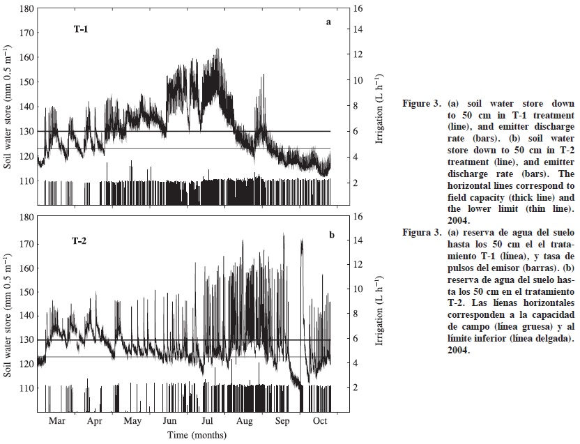 In treatment T-2 a different pattern of the soil water store was observed (Figure 3b) because the irrigation doses and frequency were scheduled in accordance with the transient soil moisture content and the above mentioned limits (+10% and 5% field capacity) (Mounzer, 2005). The soil water content remained above the lower limit throughout the experimental period (except during one week of September due to a malfunction in the head unit programmer).