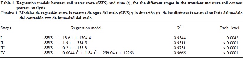 Continuous soil water content measurement by capacitance FDR probe has the advantage over other conventional methods (gravimetric, soil water potential, neutron probe) of allowing access to data in real time, so that variations can be analysed taking into account the soil characteristics, root uptake, climatic conditions and limitations of the capacitance probe itself. The transient soil water content after irrigation was divided into different phases (fitted to polynomial model regressions) according to the effect of different driving forces.