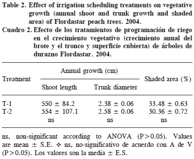 Shoot and trunk growth were not affected by the irrigation treatment. Average trunk diameter at the beginning of the experimental period was about 5 cm and grew 2.5 cm during the year, with no significant differences between treatments (Table 2). Annual growth of terminal shoots, with an initial basal diameter of 10 mm and initial length of 30 cm was similar in both treatments (≈552 cm, Table 2). The canopy shaded area was not affected too by the irrigation treatments (Table 2).