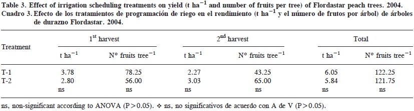 No statistically significant differences were found between treatments in the total weight of fruits at harvest or in the number of fruits per tree (Table 3). The yield obtained can be considered adequate for local peach production (Ministerio de Agricultura Pesca y Alimentación, 2003), and slightly higher than that found in early Italian peach trees (Caruso et al., 1997). The analysis of variance also indicated no significant effect of picking date on yield, indicating that harvest was not delayed by the different irrigation treatments (Table 3).