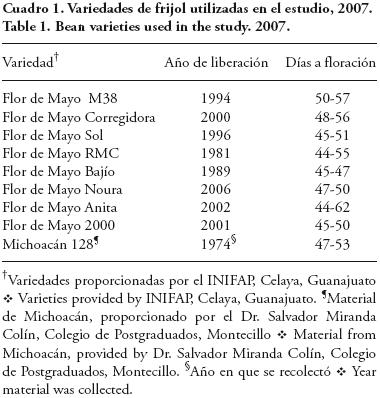 Se usaron ocho variedades de frijol tipo FM utilizadas en siembras de R y S en la región templada subhúmeda; además se incluyó el material criollo Michoacán 128 (Cuadro 1).