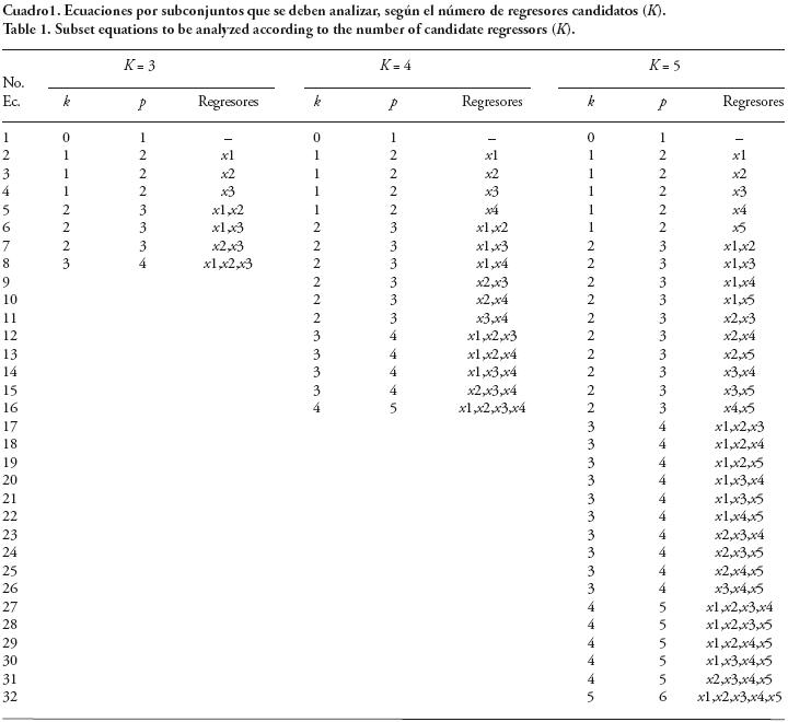 Debido a que en la transferencia de información hidrológica difícilmente se dispone de cinco registros aledaños o regresores candidatos, el procedimiento sugerido para el análisis de las regresiones por subconjuntos, es el de procesar todas las ecuaciones posibles, las cuales se indican en el Cuadro 1.