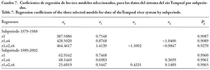 Con base en los resultados del Cuadro 5, se seleccionaron tres ecuaciones de regresión. La primera incluye sólo a x1 (Tempoal) como regresor y corresponde a los menores valores del cuadrado medio de los residuos (Ecuación 6) y de la estadística de Mallows (Ecuación 7). La segunda con regresores x1 y x4 (El Cardón) presenta el coeficiente de determinación múltiple ajustado más alto (Ecuación 5) y el segundo cuadrado medio de los residuos (Ecuación 6) más bajo, en los modelos de dos regresores. La tercera tiene por regresores x1, x2 (Terrerillos) y x4, con el coeficiente de determinación múltiple mayor (Ecuación 4) y el menor cuadrado medio de los residuos en los modelos de tres regresores.