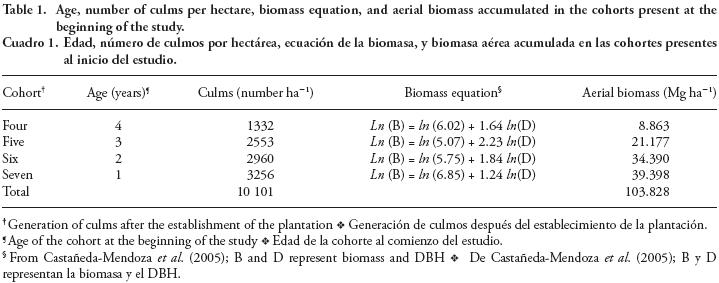 The aerial biomass present at the beginning of the study was estimated from the biomass equations developed for the plantation under study by Castañeda-Mendoza et al. (2005), and the data obtained from the diametric structure in the inventory for this work (Table 1). The biomass generated by incorporation of culms emerged during the last growing season was estimated by a biomass prediction equation for the culms belonging to the eighth generation, using a similar equation as for the seventh cohort (Table 1).