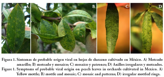Desde 2005 se ha observado la presencia, incremento y distribución de daños foliares en plantas de durazno en diferentes localidades de el Estado de México, estados de Morelos y Puebla. Estos daños se caracterizan por moteados y mosaico de color amarillo en las hojas (Figura 1 A y B). Los moteados al crecer forman mosaicos y patrones lineales (Figura 1 C) o anillos irregulares (Figura 1 D). Los tejidos dañados se desprenden dejando perforaciones irregulares con márgenes necróticos. El follaje de las plantas afectadas adquiere una tonalidad amarillenta o clorosis y causa una defoliación severa. Los frutos pueden presentar manchas tenues anilladas de color rojizo y redución del tamaño y color del fruto, así como un retraso en su madurez (observación personal del primer autor).