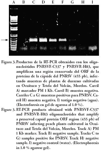 La presencia del PNRSV por RT-PCR se determinó en 90 % de las muestras recolectadas con los síntomas de moteado amarillo, obteniendo un producto de 455 pb (Figura 3, carriles C a F). En algunas muestras se obtuvieron señales tenues de los productos de la RT-PCR o bien fueron negativas, aún con síntomas de moteado amarillo (Figura 3, carriles G y H, respectivamente), que indica que la concentración del ARN de PNRSV pudo ser diferente entre las muestras recolectadas (Sánchez-Navarro et al., 1998; Dal Zotto et al., 1999; Yuyemoto et al., 2003).