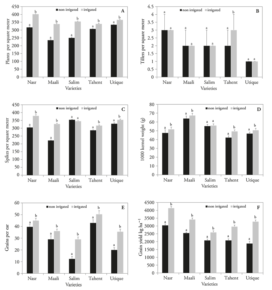Nasr (trigo duro) en condiciones de riego mostró el rendimiento mayor (4.1 Mg ha-1) en comparación con Maâli (3.41 Mg ha-1) y Salim (2.5 Mg ha-1). Por ello, Nasr se considera una variedad adecuada, en conjunto con el riego, para mejorar el rendimiento. Tahent y Utique (trigos harineros) reportan la misma tendencia en el rendimiento de semillas en condiciones de riego (2.96 y 3.28 Mg ha-1) y sin riego (2.08 Mg ha-1 y 1.88 Mg ha-1, respectivamente).