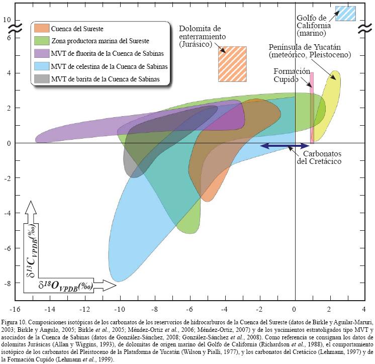 En la Figura 10 se representan los datos isotópicos de C y O disponibles de yacimientos petrolíferos de la Cuenca del Sureste (Prinzhofer et al, 2000; Birkle y AguilarMaruri, 2003; Birkle y Ángulo, 2005; Birkle et al, 2005) y de yacimientos minerales de la Cuenca de Sabinas (GonzálezSánchez etal, 2007, 2008; GonzálezSánchez, 2008). De esta última, existe un conjunto de 300 datos que abarca todos los distintos tipos mineralógicos de yacimientos estratoligados (PbZn o MVT en sentido estríeto, barita, fluorita, y celestina). Para los yacimientos tipo MVT y asociados, se analizaron rocas carbonatadas frescas y alteradas de la Formación Cupido o de formaciones correlacionables estratigráficamente con ésta, calcita fétida de color gris con inclusiones fluidas con hidrocarburos, y calcita blanca sin presencia evidente de hidrocarburos en inclusiones fluidas.