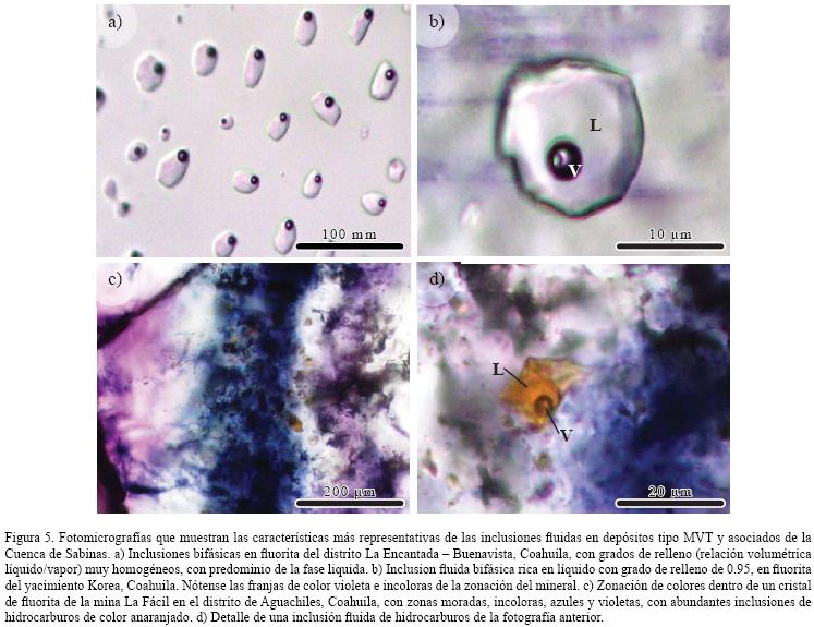 Las inclusiones de hidrocarburos acompañadas de una fase acuosa presentan salinidades de ~14 wt.% NaCl equiv., generalmente bajas concentraciones de CO2 y azufre, y relaciones CH2/CH3 altas, lo que corresponde a aléanos de la cadena C16 (GonzálezPartida et al, 2003). De acuerdo con GonzálezPartida et al. (2002, 2003), la formación de los mantos de fluorita está ligada a fluidos representados por (1) inclusiones con altas concentraciones de metano, de alta salinidad, y formados a presiones mínimas de 300 bar y Thde 105°C, (2) inclusiones de metano con H2S que coexisten con inclusiones de hidrocarburos a 180 bar y Th de 100°C, y (3) inclusiones con concentraciones variables de metano y salinidades medias, a 160 bar y Th de 120°C, que son las predominantes en el yacimiento.
