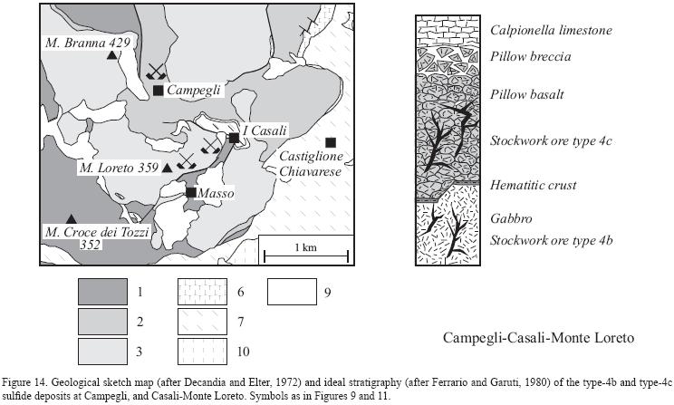 The CampegliCasaliMonte Loreto mining area is located at the southernmost edge of the Valgraveglia ophiolite complex, (Figure 8). Here, stratigraphic sections showing transition from the mantle peridotitegabbro basement to the pillowlava are exposed at several localities. At Monte Loreto, pillow basalt overlays serpentinized mantle tectonite, whereas to the north, in the area of Campegli, they cover a huge body of gabbro (Figure 14). The transition is marked by an erosion surface in both cases, indicating that the peridotitegabbro basement was exposed onto the seafloor for a long time before outflow of pillow basalt. The occurrence of ophicalcite breccia and hematitized soils at the top of serpentinite and gabbro support this assumption (Ferrario and Garuti, 1980). Two types of stockwork vein deposits are known in the area.