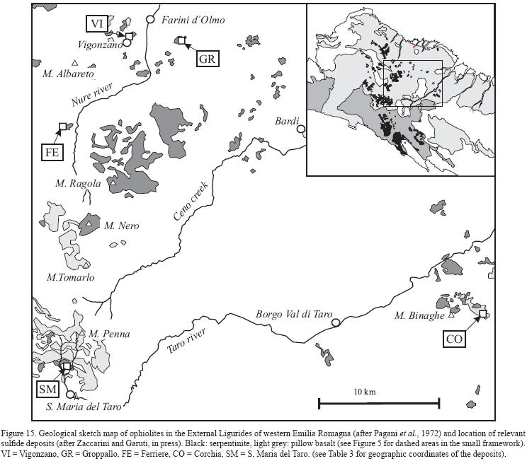 The ophiolite complexes of the External Ligurides are spread along the northern Apennine chain, over a distance of more than 150 km. Relevant deposits occur in the mountain territories of western and central Emilia Romagna. The type and location of major ore deposits of the External Ligurides are summarized in Table 3.