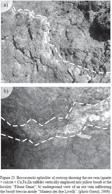 Several mining sites are known in the westnorthwest part of PoggioBiancoDragone, and north of Cinghio del Corvo. The deposits consist of reticulate quartzcalcitesumde veins varying from centimeters to more than one meter in thickness. The veins are emplaced in hydrothermally altered pillow basalt and basalt breccia. When hosted in pillow basalt the veins have cross cutting setting with preferential strikes close to 60° and 120° and subvertical dip (Figure 23a). The veins display a permeabilitycontrolled concordant setting when emplaced into the breccia horizons (Figure 23b). The ophiolitic sandstone is not mineralized, although it shows diffuse infiltration by minute carbonate fissure filling, probably formed after the main hydrothermal event. The sulfide ore occurs as lowto highgrade dissemination of pyrite, chalcopyrite and sphalerite, with accessory galena, within the quartzcalcite gangue, accompanied by accessory chlorite, epidote, titanite and datolite. In general, pyrite has euhedral boundaries and is replaced by chalcopynte and sphalerite; however a late generation of pyrite is common, filling cracks and fissures in the other sulfides. Sphalerite typically contains blebs of chalcopyrite and pyrite concentrated in the core of the crystal, surrounded by homogeneous rims. A minute dissemination of pyrite is observed to extend into the country rock basalt for a few meters. In the sulfide ore biogenic features and AuU minerals are systematically absent.