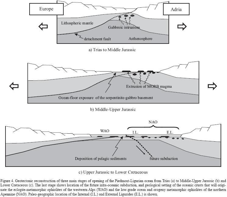 The PiedmontLigurian oceanic basin (Figure 3) formed by rifting of the Europe and Adria continental plates, in chronological connection with the northern Atlantic ocean opening (Dewey et al, 1973; BijuDuval et al, 1977; Abbate et al, 1980; Barret, 1982). Passive extension, possibly driven by an asymmetric detachment fault (Lemoine etal., 1987), initially caused: a thinning of the continental crust, the upwelling of ProterozoicPermian subcontinental lithospheric mantle, and a progressive intrusion of numerous and relatively small gabbro bodies into the upper mantle (Trias to Middle Jurassic) (Figure 4a). A small ocean basin started to open by pull apart in the continental plates, and the peridotitegabbro basement was exposed at the spreading seafloor, prior to outflow of MORBtype volcanics and deposition of radiolarian cherts (UpperJurassic) (Figure 4b). Massive and pillow basalts formed a laterally discontinuous and relatively thin volcanicsheet, so that pelagic sediments rested directly on the eroded peridotitegabbro basement. Prolonged seafloor exposition generated thick ophicalcite horizons at the top of mantle peridotites. Thick deposits of ophiolitic breccia composed of serpentinite, gabbro, basalt and sedimentary fragments accumulated in topographic depressions along valleys and fault scarps of the rugged seafloor, and now form the cover of the peridotitegabbro basement or pillowlavas (Cortesogno et al, 1978, 1987; Barret, 1982; Principi et al, 1992). Recession of the seafloor from the axial rifting zone led to progressive burial of the igneousvolcanic basement under pelagic sediments (Figure 4c). The early phases are characterized by deposition of various types of cherts containing Mnore deposits (Bonatti et al, 1976; Cabella et al, 1998), passing upward to Lowerand UpperCretaceous carbonatesiliciclastic sediments, overlain by various kinds of arenaceous turbidites (UpperCretaceous to Paleocene).