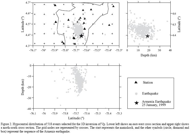 Se seleccionaron tiempo de arribos de ondas P de 518 eventos (principalmente réplicas) del sismo de Armenia (Colombia) del 25 de enero de 1999 (Mw=6.2), registrados por una red temporal de 23 estaciones durante el período de Febrero de 1999 a Julio de 2001, han sido invertidas simultáneamente para localización de hipocentros y estructura 3D de velocidad de onda Vp. La geología superficial de esta área sugiere una compleja disposición de placas tectónicas compuesta por rocas diversas y atravesada por el sistema de fallas de Romeral (SFR). Sin embargo, haya una muy buena correlación entre zonas de velocidad alta y rocas oceánicas antiguas afectada por rocas plutónicas. Cinturones de rocas metamórficas que rodean estas rocas están bien correlacionados con zonas de baja velocidad. La estructura geológica en profundidad es resuelta con una estructura de flor donde la falla Córdoba se movió en el sismo de Armenia en un contacto entre rocas de alta y baja densidad. La zonas de baja velocidad corresponderían a rocas antiguas en la cordillera central. Inferimos que el volumen de la secuencia del sismo está entre las coordenadas 75.64°75.72° W, 4.38° 4.52° N y a una profundidad entre 521 km; el volumen es de 2 200 km3. La mayoría de las réplicas bien localizadas ocurrieron por encima del hipocentro del terremoto de Armenia.
