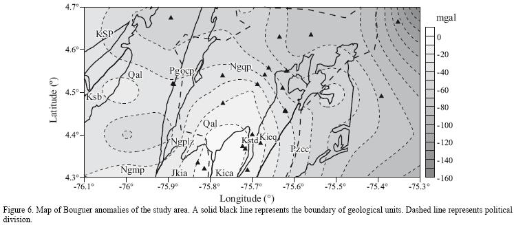 Figure 6 shows the Bouguer anomaly map of the study area (IGAC and INGEOMINAS, 1998) where we see highdensity anomalies located toward the central part with trend NNE and wrapping lowdensity anomalies. This pattern coincides with velocity anomalies and oceanic rocks distribution. On the other hand, the Figure 7 shows three cross sections located at latitudes 4.4°N, 4.5°N and 4.6°N, where we see lower resolution towardnorth the Armenia earthquake. The two more representative cross sections located at latitudes 4.4°N and 4.5°N allowed us to detect highvelocity zones that are interrupted by lowvelocity zones in a horizontal and vertical pattern. In particular, a structural interpretation of the cross section at latitude 4.4°N (Figure 8) has been done following the structural model proposed by Ospina and Gallego (2002). In this interpretation we suggest that the disposition of tectonic flakes in depth be solved with a flower structure (Ospina and Gallego, 2002) where the Cordoba fault slipped in a contact between highand lowdensity rocks during the Armenia earthquake. The lowvelocity zones would correspond to the oldest rocks that constitute the nucleus of the Central mountain range such as Pzcc. Finally, because there is not significant change in the final hypocenter locations, we infer that the source volume of the Armenia Earthquake sequence lies within 75.64° 75.72° W, 4.38° 4.52°N and at a depth 5 21 km; the source volume is approximately 2.200 km3. Most of the welllocated aftershocks occurred above the hypocenter of the Armenia earthquake (Figure 8).