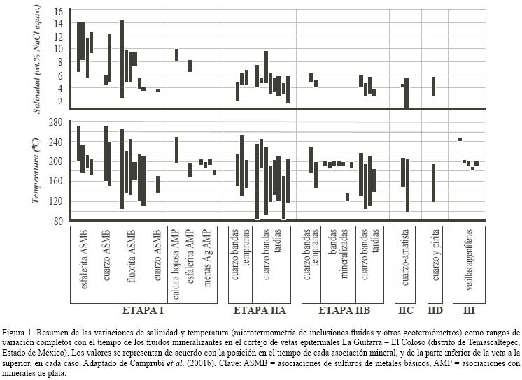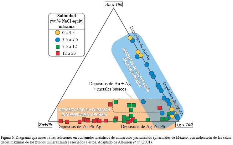 En yacimientos epitermales, la determinación de la salinidad es uno de los factores esenciales a tener en cuenta para la determinación de las diversas subtipologías de éstos (yacimientos de sulfuración alta, intermedia y baja). Dentro de un mismo depósito pueden encontrarse más de una de estas subtipologías (Camprubí y Albinson, 2006, 2007). Por ello, teniendo en cuenta que las diferentes subtipologías y diferentes estilos de mineralización presentan típicamente diferentes asociaciones metálicas, la simple determinación de la salinidad en un conjunto representativo de muestras de la misma etapa de mineralización constituye un criterio de exploración importante (Figura 6).