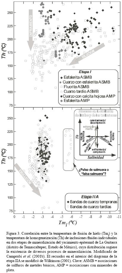 Además de las evidencias mineralógicas y texturales (e. g. en yacimientos epitermales, presencia de calcita hojosa, de adularia pseudoromboédrica o pseudoacicular, de truscottita; ver Camprubí y Albinson, 2006), la ebullición puede ponerse igualmente de manifiesto mediante el estudio de inclusiones fluidas o a partir de las relaciones molares entre los gases contenidos en ellas. Si en las zonas de ebullición se produce el atrapamiento de inclusiones fluidas, en éstas se presentará un amplio rango de variación de las relaciones líquido/vapor. Cabe destacar que, de hallarse sólo inclusiones muy ricas en vapor e inclusiones muy ricas en líquido, sin inclusiones con relaciones líquido/ vapor intermedias, es más posible que nos encontremos en una situación que refleja más bien un proceso de estrangulamiento de las inclusiones fluidas (también denominado encuellamiento, o necking). En tal caso es preferible optar por la cautela y no deducir que ello constituye evidencia de ebullición. La presencia de agrupaciones de inclusiones fluidas en que todas ellas son ricas en vapor, en cambio, constituye una mejor evidencia de ebullición. No siempre es posible encontrar inclusiones fluidas dentro de la propia zona de ebullición, pero pueden hallarse formas indirectas para evidenciar la existencia de este mecanismo de precipitación. Puesto que durante la ebullición se produce la separación de una fase vapor (hacia la cual se fraccionarán mayoritariamente los componentes más volátiles) y de una fase líquida (que adquirirá una mayor salinidad que el fluido que entró en ebullición), cabe esperar encontrar inclusiones ricas en líquido con salinidades relativamente más altas que las inclusiones anteriores, representativas de los fluidos anteriores a la ebullición. Ello, sin que haya necesariamente variaciones significativas en las temperaturas de homogeneización de unas y otras. La existencia de una sucesión como la expuesta también puede implicar la entrada de fluidos en un nuevo pulso hidrotermal sin relación alguna con la ebullición, con lo que el estudio de inclusiones fluidas tiene que apoyarse generalmente en otros métodos de análisis geoquímico (estudio de isótopos estables, geoquímica de gases, etc.). La diferencia entre ambos casos es que una ebullición puede generar "salmueras falsas", es decir, fluidos con salinidades anómalamente elevadas respecto al conjunto de datos al que pertenecen que no son representativas de la composición de fluido hipogénico alguno. Tales salmueras se habrían originado por ebullición continua "hacia el secado" de la salmuera original (Simmons y Browne, 1997). Por tanto, las salmueras debidas a ebullición no deben confundirse con fluidos ascendentes hipogénicos cuyas salinidades son originalmente elevadas o "salmueras verdaderas" (Figura 2). En la Figura 3 se ejemplifica el caso de una asociación de inclusiones fluidas con salinidades netamente mayores al resto de asociaciones de la misma etapa de mineralización. Si bien ello permite sospechar que dichos datos corresponden a una "falsa salmuera", la distribución de los datos (sin datos con salinidades intermedias entre dichas asociaciones de inclusiones fluidas) sugiere que la posibilidad más razonable es que dicha salmuera sea "verdadera".