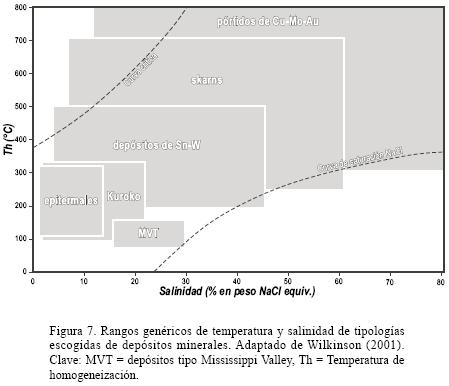 En el caso que las variables microtermométricas de las inclusiones fluidas puedan ser reveladoras de mineralizaciones económicas, los criterios de guía en base a rangos de temperatura o de salinidad varían en función del tipo de yacimiento mineral y, en algunos casos, varían entre yacimientos distintos de la misma tipología. Por ello, es necesario que el prospector posea un conocimiento suficiente acerca del tipo de yacimiento que se encuentra bajo exploración, no sólo acerca de la zonación mineral o metálica esperable para cada tipología, sino también acerca de los tipos de zonación térmica y las características petrográficas y fisicoquímicas de las inclusiones fluidas que pueden presentar. Asimismo, es preciso poseer conocimientos suficientes para poder interpretar el significado de la geometría de las isotermas determinadas a partir del estudio microtermométrico de inclusiones fluidas, o a través de otros geotermómetros (paragenéticos, composicionales, isotópicos, etc.). Wilkinson (2001) identificó las características petrográficas y fisicoquímicas genéricas de las inclusiones fluidas y, por extensión, de los fluidos mineralizantes en algunas de las tipologías de yacimientos minerales económicamente más importantes (Figura 5 y Tabla 2 en Wilkinson, 2001). Igualmente, dicho autor ilustra los principales procesos de mineralización en dichas tipologías y las variaciones en temperatura y composición de las inclusiones fluidas y sus fases constitutivas. Entre otras particularidades, dicho autor hace hincapié en (1) la alta densidad y baja temperatura de las salmueras mineralizantes en depósitos tipo MVT, (2) la notoria mayor temperatura de los fluidos en depósitos de PbZnAgBa de "Tipo Irlandés" que en MVT, (3) la mayor temperatura y salinidad de fluidos en stockworks que en la parte superior de los depósitos de sulfuros masivos vulcanogénicos tipo Kuroko, (4) el amplio rango de variación de temperatura y salinidad, así como en la mineralogía de cristales hijos en depósitos de SnWCu asociados a granitoides y en depósitos metalíferos (CuAuMo) en pórfidos, (5) la práctica correspondencia entre temperatura de homogeneización y de atrapamiento en depósitos epitermales y (6) la ubicuidad del CO2 en depósitos mesotermales.