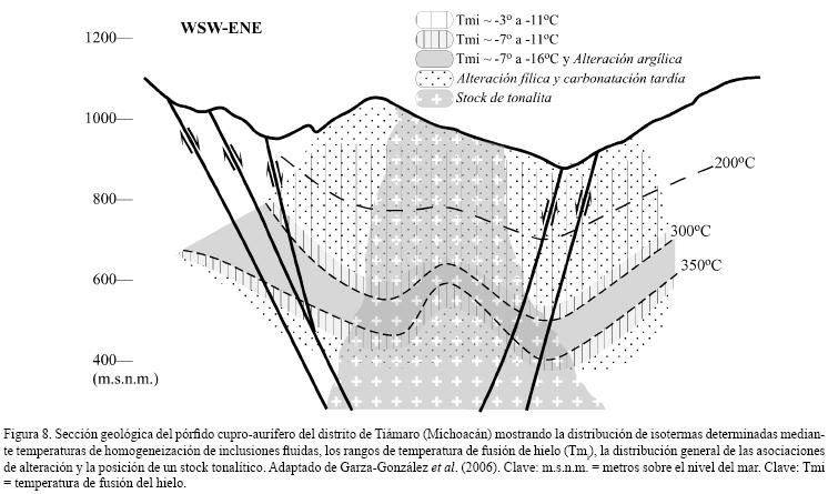 Los elementos mineralógicos a relacionar para ser usados como criterios adicionales comprenden tanto la mineralogía de los halos de alteración hipogénica (Figura 8) como la mineralogía o las asociaciones metálicas de los mismos cuerpos mineralizados (Figura 6). Tales elementos pueden agruparse en dos categorías: (1) la presencia de un mineral o asociación mineral diagnóstica de una temperatura o ambiente químico concreto (e. g. caolinita ± alunita ± dickita, asociación adularia + epidota), sin constituirse necesariamente en geotermómetros precisos y (2) el diámetro máximo y la morfología de los cristales y agregados cristalinos de un mineral común (e. g. clorita, hematites, epidota), pues su abundancia en el depósito permite relacionar sus características con una temperatura relativa. Por ejemplo, en algunos yacimientos epitermales de sulfuración intermedia y baja de México se ha observado la presencia de una estrecha relación paragenética entre adularia y epidota en asociaciones minerales tempranas de etapas portadoras de mineralizaciones ricas en metales básicos y plata, a temperaturas ~300°C. En algunos yacimientos, como en la Veta Zuloaga del distrito de San Martín de Bolaños (Jalisco), se ha identificado una zona de alteración argílica profunda bajo las zonas mineralizadas, a temperaturas ~300°C (Albinson y Rubio, 2001; Camprubí y Albinson, 2007). Asimismo, el conjunto de tipologías de yacimientos en pórfidos metalíferos skarns epitermales se ha beneficiado de estudios mineralógicos en asociaciones de alteración hidrotermal en campos geotérmicos activos (e .g. Reyes, 1990, 1991).