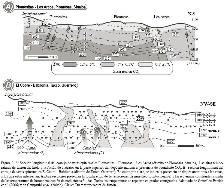 La zonación térmica de los yacimientos, determinada según un patrón de isotermas de temperaturas significativas, permite la identificación de canales de ascenso de fluidos y de zonas de dispersión hidrotermal (Figura 9). Dichos canales o zonas de alimentación preferencial se identifican por la presencia de domos térmicos (según el trazado de las isotermas) a cuya elevación en otras áreas se encuentran isotermas de menor temperatura. Por lo común, se considera que cuanto más pronunciado es el domo térmico, más probable es la existencia de un canal de ascenso hidrotermal preferencial. Para la determinación lo más certera posible de patrones de este tipo es imprescindible haber caracterizado con detalle previamente la zonación del depósito, al menos en términos de secuencia temporal. Ello, a efectos de consignar debidamente la información microtermométrica a cada etapa o subetapa de formación del depósito. En ocasiones, los patrones de distribución de isotermas entre diferentes etapas no son en absoluto similares. Ello no constituye necesariamente un elemento de sospecha acerca de la validez de los datos o del tratamiento de éstos. Sin embargo, en los casos en que los patrones de distribución de las isotermas son similares de una etapa a otra, puede considerarse (especialmente en los casos en que patrones similares son debidos a datos de muestras distintas) que (1) los datos de una etapa "validan" comparativamente los datos de otra etapa y que, por tanto, (2) la presencia de canales de ascenso hidrotermal u otros patrones térmicos es consistente en el tiempo, por lo que pueden derivarse interpretaciones de índole estructural.