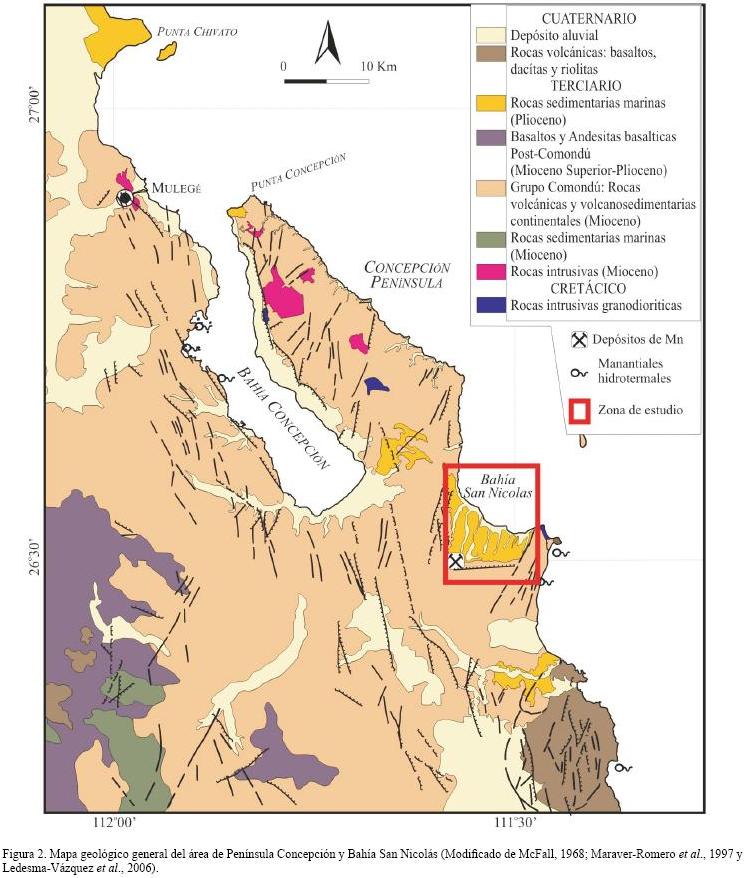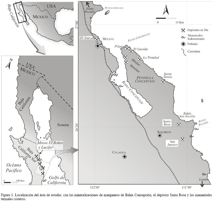 En la zona de Bahía Concepción, Baja California Sur, abundan las manifestaciones hidrotermales fósiles, como depósitos de óxidos de Mn emplazados en vetas, stockworks y brechas (El Gavilán, Mantitas, Minitas, Pilares, Trinidad y La Azteca), y actuales, como manantiales termales costeros formando precipitados en vetas y costras con óxidos de Mn (RodríguezDíaz, 2004; Camprubí et al., 2008). Los manantiales termales en la zona, Agua Caliente y Santispac, presentan depósitos que se componen principalmente de romanechita, pirolusita, todorokita, barita y ópalo (Canet et al., 2005b; BlancoFlorido, 2007). Las mineralizaciones en vetas están encajonadas normalmente en rocas volcánicas continentales del OligocenoMioceno y están controladas por un sistema de fallas normales de dirección NOSE, que tiene relación con eventos tectónicos extensivos terciarios asociados a la apertura del Golfo de California.