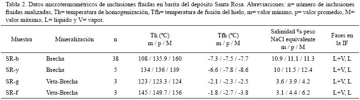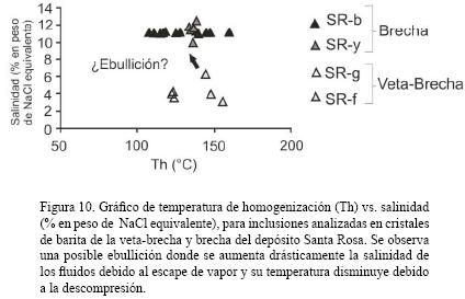 Las mediciones de IF alojadas en barita indican dos poblaciones de IF: una de Th modal de 120°125°C y salinidad promedio de 4.2 wt. % NaCl y otra de Th modal de 110°115°C y salinidad promedio de 11.4 wt. % NaCl. Estas poblaciones podrían señalar la existencia de dos fluidos con rangos de temperatura similares pero con variaciones en la salinidad, lo cual es común durante procesos de fraccionamiento composicional producto del proceso de ebullición de los fluidos. Sin embargo, no se han observado evidencias de coatrapamiento de IF salinas y de IF ricas en vapor en las muestras del depósito Santa Rosa, lo cual sería una evidencia de la ocurrencia de ebullición. Esto se puede deber a que en las zonas de sistemas hidrotermales con presencia probada de ebullición, se ha observado que solamente el 1% de la población total de IF son inclusiones ricas en vapor (Simmons y Christenson, 1994), por lo cual se deberían analizar más muestras para aumentar la probabilidad de encontrar inclusiones ricas en vapor. La ebullición es uno de los procesos más efectivos para la precipitación de minerales de mena, en especial minerales preciosos (Simmons y Christenson, 1994).