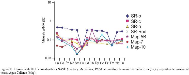 El contenido de REE normalizado al compuesto de lutita de América del Norte (NASC, por sus siglas en inglés; Taylor y McLennan, 1985) se muestra en la Figura 11. Los perfiles normalizados de las REE de las menas de Santa Rosa muestran una anomalía negativa de Eu y una moderada anomalía negativa de Ce. En los precipitados del manantial termal Agua Caliente se observa solamente una anomalía negativa en Ce poco pronunciada, lo cual coincide con las muestras de mena de Santa Rosa. Las anomalías negativas de Eu/Eu* y Ce/Ce*, calculadas mediante la expresión de McLennan (1989), para las muestras de Santa Rosa varían en un rango de 0.017 a 0.030 y 0.074 a 0.123, respectivamente. Para los precipitados de Agua Caliente los valores de Ce/Ce* se sitúan entre 0.053 y 0.112
