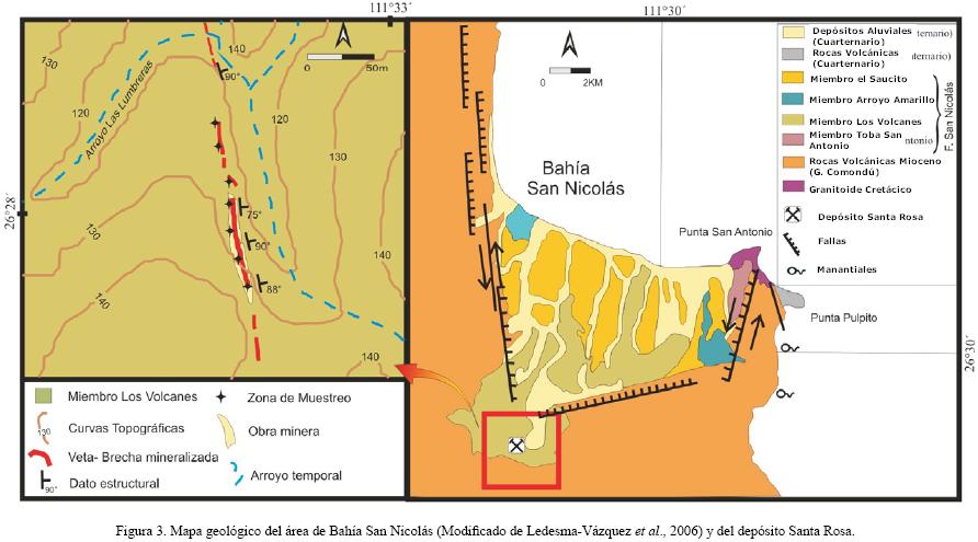 Al sureste de Bahía Concepción (Figura 2), las formaciones Infierno y San Nicolás, de edad Plioceno Tardío, se encuentran sobreyaciendo discordantemente al Grupo Comondú (LedesmaVázquez, 2000; LedesmaVázquez et al., 1997, 2006). La Formación Infierno consiste de depósitos sedimentarios transgresivos, principalmente conglomerados volcánicos, areniscas, lodolitas, nódulos y capas de sílex con estructuras de reemplazamiento (Johnson et al., 1997; RodríguezDíaz, 2004). En el área de San Nicolás, sobreyaciendo a las rocas de la Formación El Salto del Grupo Comondú, se encuentra una serie de flujos de lava y tobas líticas, conglomerados, calizas y biocalcarenitas, a la Formación San Nicolás (Figura 3; Swalan y Smith, 1984; LedesmaVázquez et al., 2006). Esta formación se divide en cuatro miembros: (a) la toba volcánica de San Antonio, (b) Los Volcanes, (c) Arroyo Amarillo y (c) El Saucito. El miembro Los Volcanes es un conglomerado matrizsoportado, depositado en ambiente de abanico aluvial. Dicho conglomerado contiene clastos de composición andesítica del Mioceno, con morfologías entre bien redondeadas y subangulosas. Es en este miembro donde se aloja la estructura mineralizada de Santa Rosa.