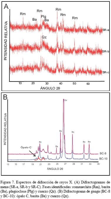 En los análisis de DRX realizados a tres muestras representativas de la mena (SRa, SRb y SRc) es posible observar los picos característicos de la romanechita (2.41, 2.19 y 3.48 Å) (Smith y Mrose, 1974). De igual modo se determinó la presencia de cuarzo, plagioclasa y barita como fases accesorias (Figura 7).