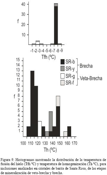 Los histogramas de Th y Tfh (Figura 9) y el gráfico de Th vs. salinidad (Figura 10) sugieren dos poblaciones de inclusiones, la primera con Th de 123° hasta 156°C, Tfh que varían de 1.8° a 3.8°C y salinidades calculadas con valores entre 3.1 a 6.2 wt. % NaCl y una segunda población con Th moderadamente variables entre 108 y 160°C, Tfh con un intervalo entre 6.6° a 8.6°C y salinidades en el rango de 10 a 12.4 wt. % NaCl. Así, el primer grupo se caracteriza por Th de intervalo modal de 120° 125°C y salinidad promedio de 4.2 wt. % NaCl y el segundo por Th de intervalo modal 110° 115°C y salinidad promedio 11.4 wt. % NaCl.