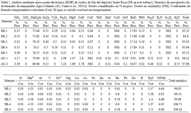 La composición de la romanechita en los precipitados de los manantiales termales costeros de Agua Caliente (Tabla 1), a diferencia de la romanechita del depósito Santa Rosa, presenta un mayor contenido en Si, Mg, Ca y Fe (Tabla 1; Canet et al., 2005a). Sin embargo, las concentraciones de Ba en la romanechita de Santa Rosa son mayores que en Agua Caliente (Tabla 1).