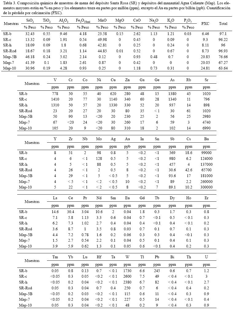 La composición química de las menas de óxidos de manganeso de Santa Rosa y de tres muestras de precipitados del manantial termal de Agua Caliente (costras y veta de barita, ópalo, óxidos de manganeso y oxhidróxidos de hierro) se presentan en la Tabla 3. Los componentes químicos más abundantes en las muestras son: manganeso, de 23.6 a 50.0 % en peso de MnO, sílice, de 13.3 a 32.4 % en peso de SiO2, y bario, de 9.9 a 13.7 % en peso de BaO. Además, en cantidades menores hay aluminio, con valores entre 1.8 y 9.5 % en peso de Al2O3, hierro, de 0.5 a 4.2 % en peso Fe2O3 (total), y calcio, de 0.2 a 2.6 % en peso de CaO. En cantidades por debajo del 1 wt. %, se detectan Sr, Sb, As, V, W, Cu y Zn. Para las muestras de los manantiales termales, se observa la abundancia de sílice, de 31.0 a 46.2 % en peso de SiO2; bario, de 18.1 a 30.0 % en peso de BaO; aluminio, con valores entre 1.8 y 5.0, % en peso de Al2O3; hierro, de 0.93 a 2.61 % en peso Fe2O3; y con valores por debajo del 1 % en peso, se detectaron Mn, Ca, Sr, Sb, V y As.