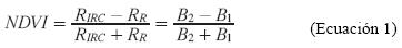 Donde, RIRC y RR son respectivamente los valores de reflectancia bidireccional de la superficie para las bandas del infrarrojo cercano y rojo, que son las bandas B2 y B1 (Tucker, 1979). Este índice da continuidad al NDVI obtenido con base en el sensor AVHRR para extender el registro de datos sobre periodos más largos en los estudios de monitoreo.