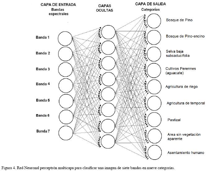 El Perceptrón Multicapa (PMC), es el algoritmo de redes neuronales más utilizado debido a su capacidad de tolerancia ante información incompleta o contaminada con ruido (Mas y Flores, 2008). Consiste en un modelo estadístico no paramétrico de regresión no lineal (Sarle, 1994) y se describe como una red de alimentación hacia adelante compuesta por una capa de unidades (neuronas) de entrada (en este caso una unidad por banda), otra capa de unidades de salida (una unidad para cada categoría) y un número determinado de capas intermedias de unidades de procesamiento, también llamadas capas ocultas porque no tienen conexiones con el exterior. Las neuronas de cada capa están conectadas a todas las unidades de la capa siguiente (Figura 4). Con esta red se pretende establecer una correspondencia entre un conjunto de entrada (respuesta espectral por ejemplo) y un conjunto de salidas deseadas (categorías de cobertura del suelo). Generalmente, el PMC usa una sola capa oculta para dividir completamente el espacio espectral por medio de hiperplanos a lo largo del cual el nivel de activación de las unidades ocultas es constante (Foody, 2000).