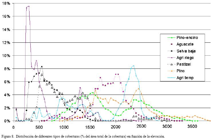 1) bosque de pinoencino, 2) bosque de pino, 3) selva baja caducifolia, 4) agricultura de riego, 5) huertas de aguacate, 6) agricultura de temporal, 7) pastizales, 8) áreas sin vegetación y 9) áreas urbanas. Este sistema es detallado comparado con los que se usan generalmente en este tipo de imágenes, como el sistema clasificatorio del International GeosphereBiosphere Programme o IGBP (Belward et al., 1999; Running et al., 1995).