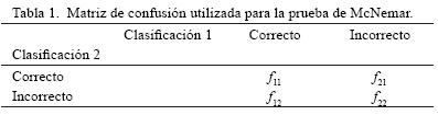 Se calcularon los valores de la fiabilidad del usuario (proporción de sitios de verificación de la categoría considerada clasificados como tal) y del productor (proporción de sitios clasificado en la categoría considerada en el mapa que están correctamente clasificados). Estos dos índices de fiabilidad están relacionados con los errores de omisión y de comisión respectivamente. Para comparar estadísticamente la fiabilidad de los mapas obtenidos por los diferentes insumos y enfoques de clasificación, se utilizó la prueba de McNemar propuesta por Foody (2004), que permite evaluar la significancia estadística de diferencias en la fiabilidad de dos clasificaciones estimada con base en los mismos datos de verificación. Es una prueba no paramétrica basada en una matriz de confusión de dos por dos que expresa las relaciones entre las confusiones de las dos clasificaciones en comparación (Tabla 1 y Ecuación 5).