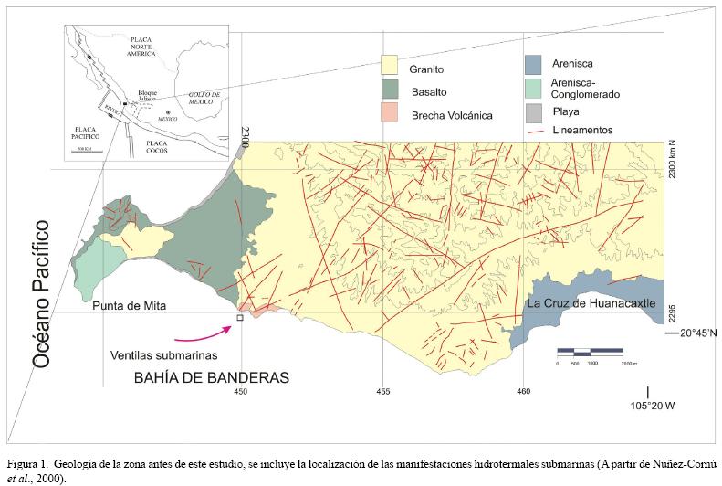 El área de estudio está localizada en la parte norte de la bahía de Banderas. A 400 de metros de la costa se descubrió la presencia de ventilas hidrotermales localizadas a 20°45.15'de latitud norte y 105°28.87' de longitud oeste; éstas se encuentran emplazadas en basaltos y a una profundidad de aproximadamente 11 m (NúñezCornú et al., 2000). Esta es una de las pocas localidades conocidas en la costa del Pacífico mexicano, donde se presenta este fenómeno tan cercano a la costa y a tan poca profundidad. Para conocer las características que las originaron es necesario definir las estructuras principales relacionadas con el transporte de los fluidos termales y su relación con la tectónica de la zona, con la finalidad de definir los procesos que generan el calentamiento y transporte de los fluidos. El objetivo de este trabajo es mejorar la información geológica de la zona cercana a las ventilas, en el que se presenten la litología y los lineamientos principales que reflejan el contexto tectónico predominante en la zona de Punta Mita, ya que el mapa con que se contaba antes de este trabajo es demasiado general (Figura 1) e insuficiente para realizar un modelo conceptual del sistema hidrotermal submarino.