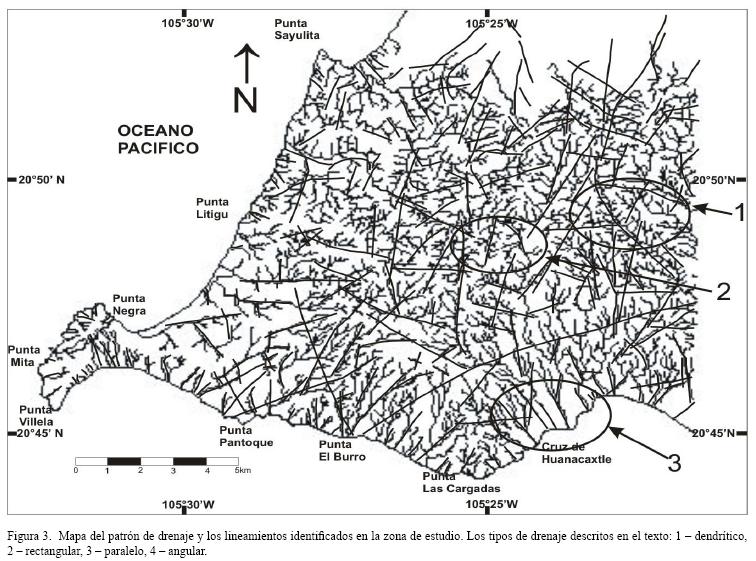 Se estableció como límite para el reconocimiento del drenaje la porción norte de Punta Sayulita al norte y Bucerías al este. Sobre la carta topográfica escala 1:50,000 se efectuó el reconocimiento del patrón de drenaje para reconocer la extensión y localización de los materiales que tienen diferencias significativas, así como la localización de los lineamientos (Figura 3), ya que el flujo superficial es controlado por el tipo de material y por zonas de debilidad litológica y estructural. De este modo fue posible identificar cuatro tipos de drenaje: